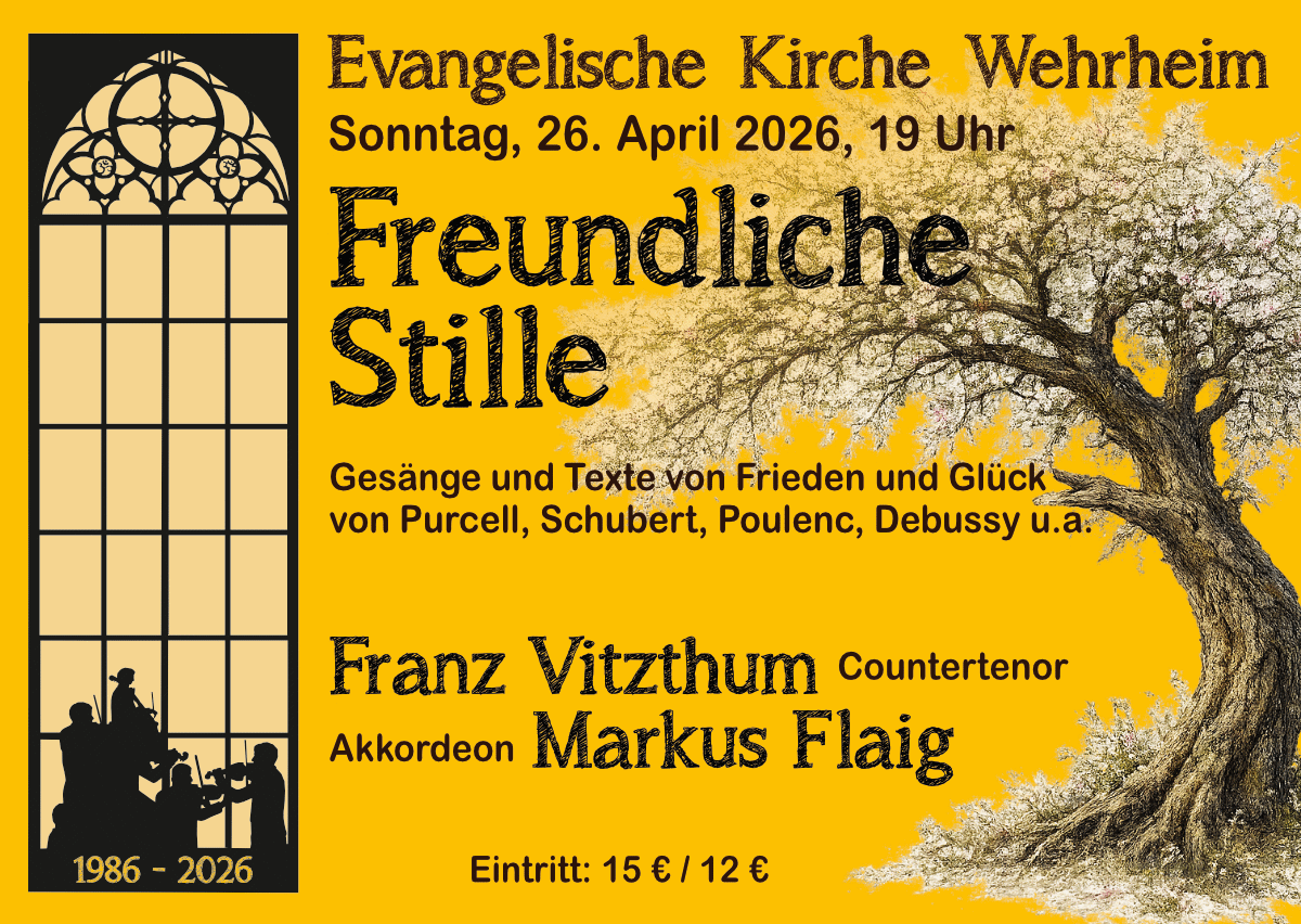 Am Sonntag, den 26. April 2026 um 19 Uhr, sind der international renommierte Countertenor Franz Vitzthum und Markus Flaig am Akkordeon zu Gast in der Evangelischen Kirche Wehrheim. Ihr Programm mit Musik unterschiedlichster Epochen spannt einen Bogen von kunstvollen Motetten der Renaissance über Werke von Bach, Schubert, Brahms, Debussy und Poulenc bis zu einer Aufführung der amerikanischen Komponistin Prof. Joanne Metcalf, die eigens für Vitzthum Texte aus dem Hohelied Salomons neu vertonte. Die beiden Künstler führen moderierend durch das Programm.